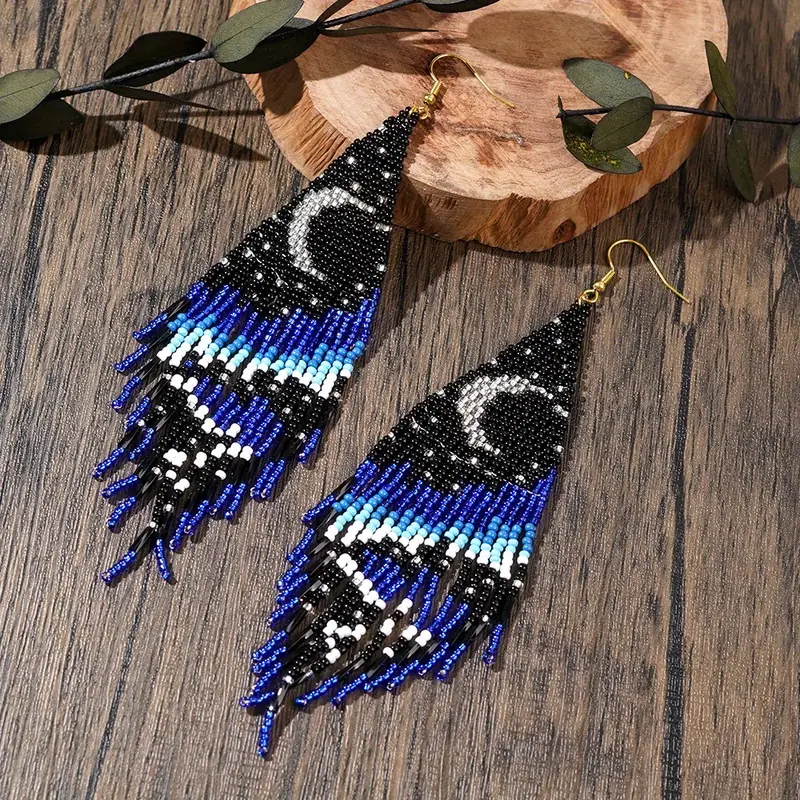 Elegant, celestial, and full of serene charm β these Blue Crescent Moon Beaded Dangle Earrings shimmer with lunar beauty. Deep blue beads glint like twilight stars, gently cascading above a silver crescent moon for a look thatβs both mystical and effortlessly chic.