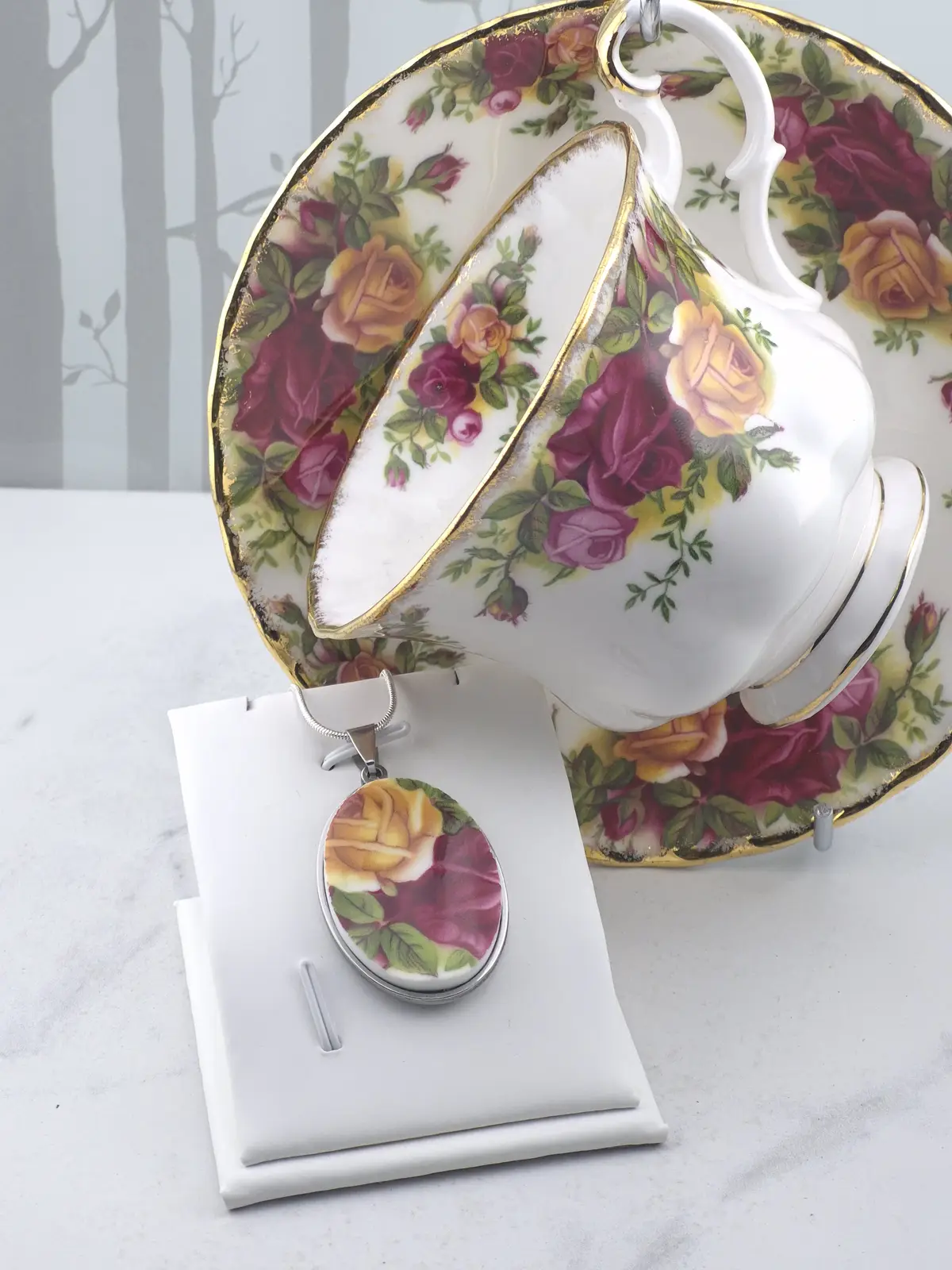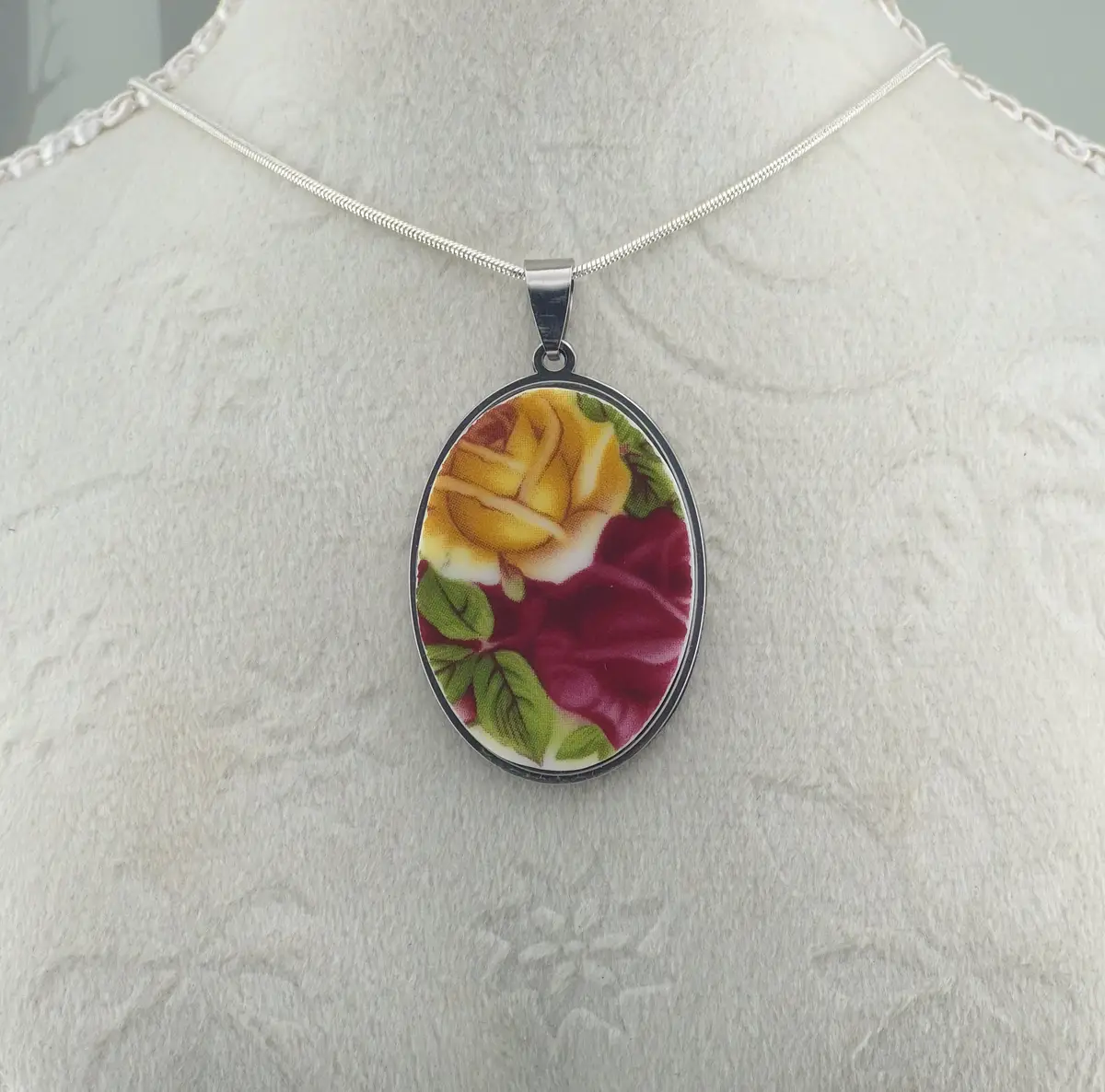 Each design is carefully cut from an original china plate, hand-shaped, and set into a silver-toned bezel. Because every section of the plate features slightly different pattern placement, no two pendants are ever exactly alike.