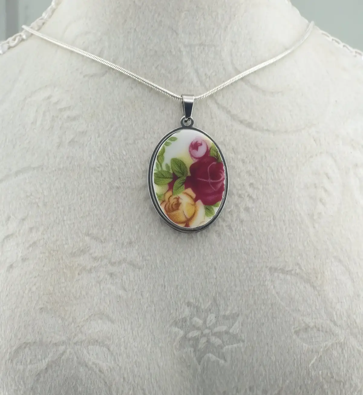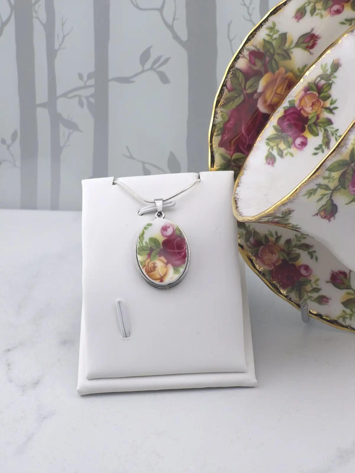 Each design is carefully cut from an original china plate, hand-shaped, and set into a silver-toned bezel. Because every section of the plate features slightly different pattern placement, no two pendants are ever exactly alike.