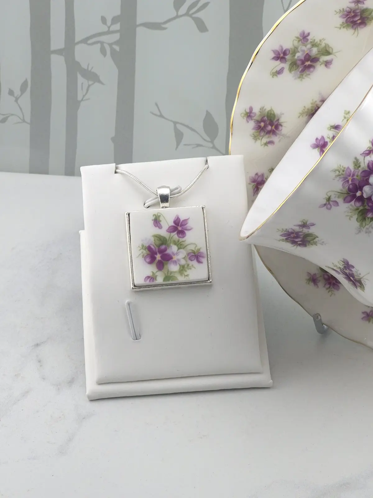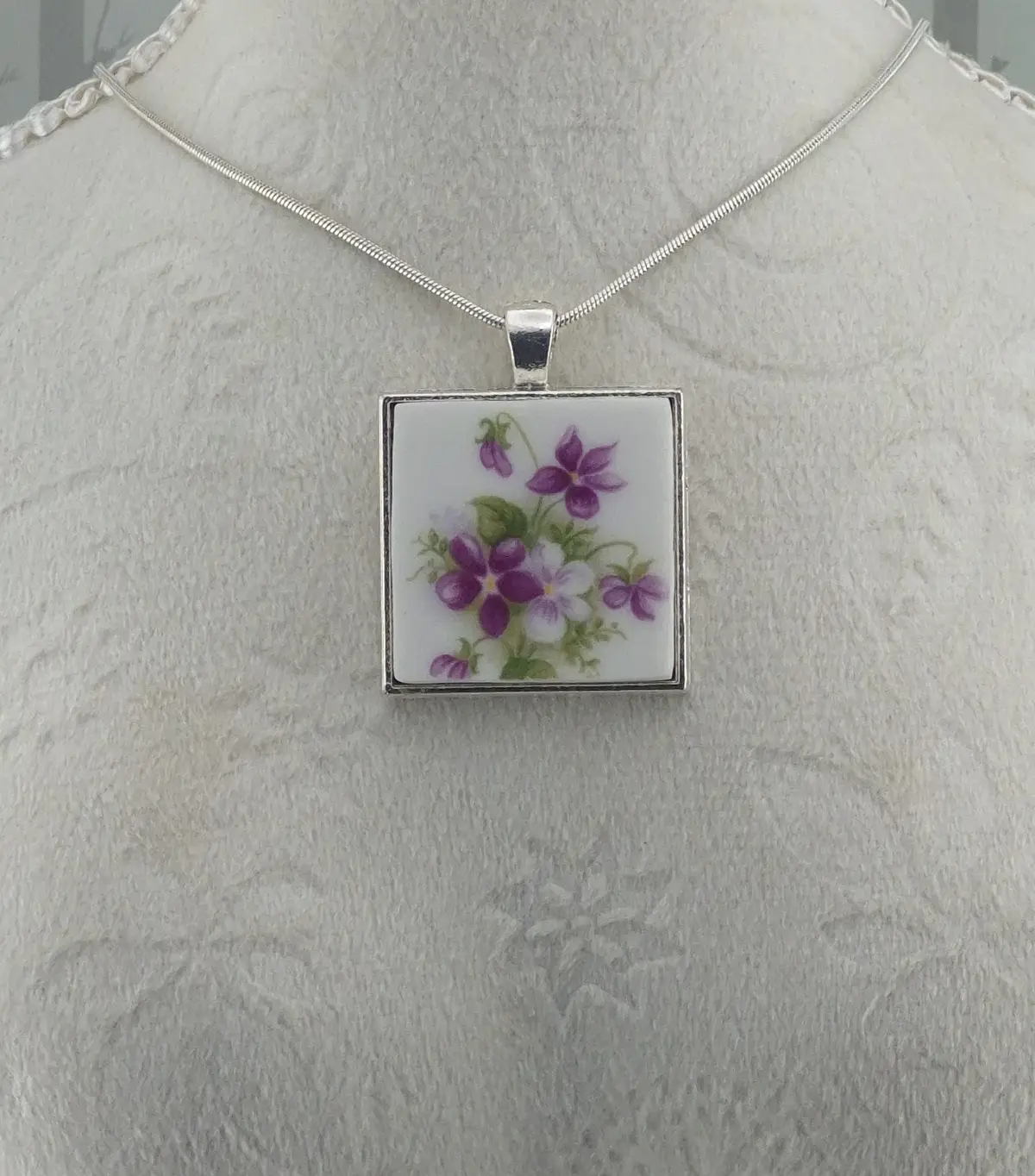 Each design is carefully cut from an original china plate, hand-shaped, and set into a silver-toned bezel. Because every section of the plate features slightly different pattern placement, no two pendants are ever exactly alike.