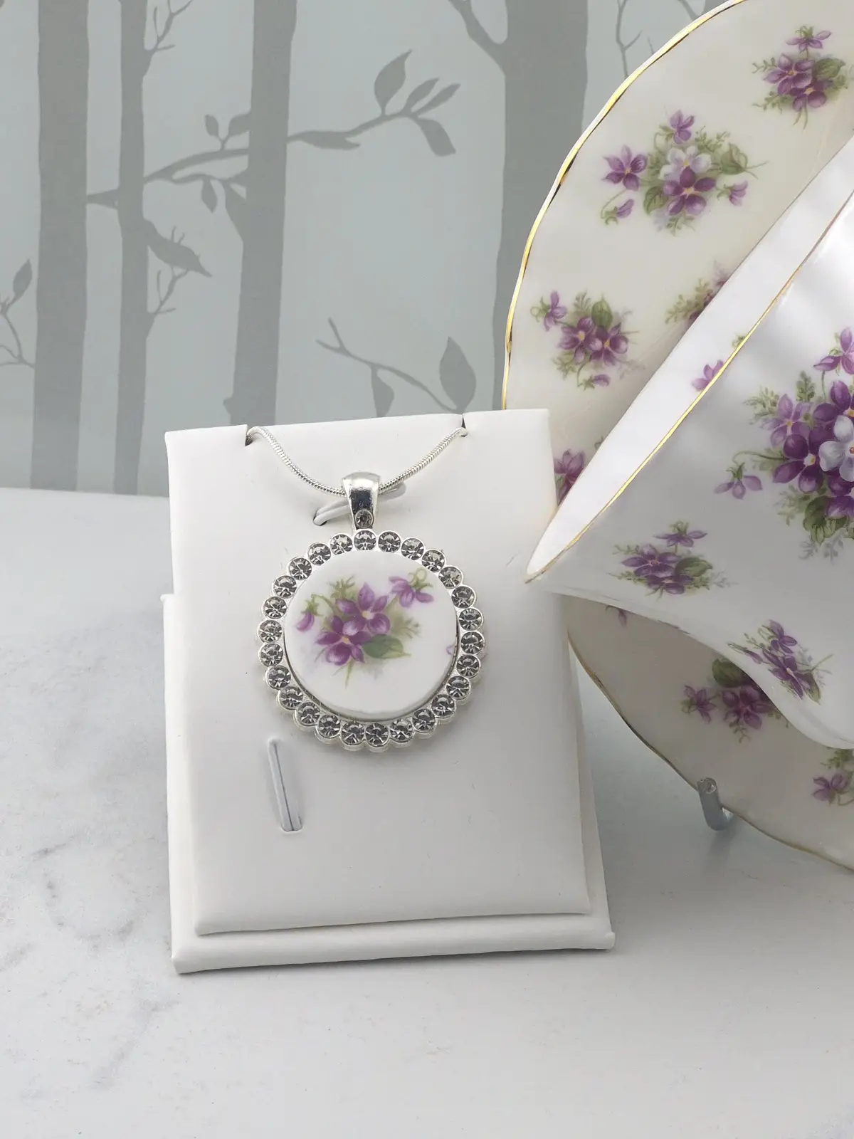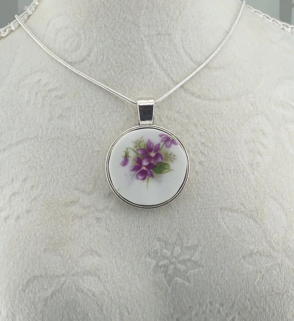 Each design is carefully cut from an original china plate, hand-shaped, and set into a silver-toned bezel. Because every section of the plate features slightly different pattern placement, no two pendants are ever exactly alike.