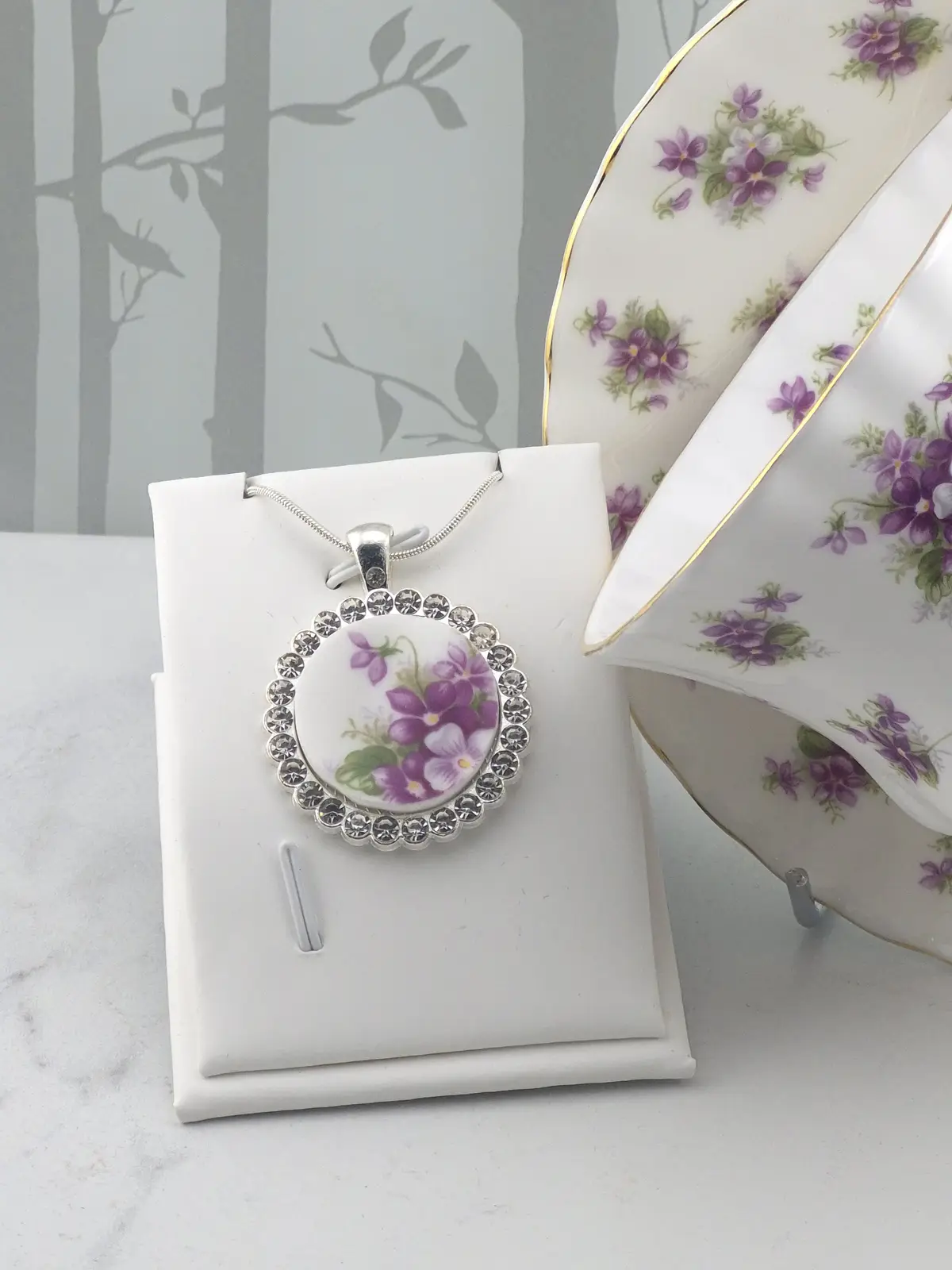Each design is carefully cut from an original china plate, hand-shaped, and set into a silver-toned bezel. Because every section of the plate features slightly different pattern placement, no two pendants are ever exactly alike.