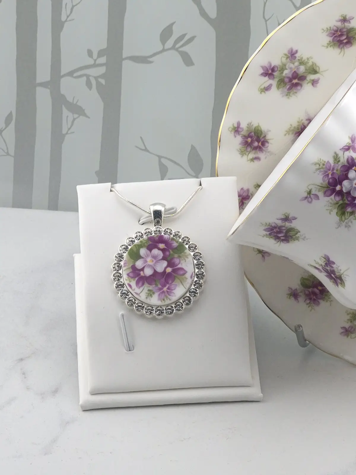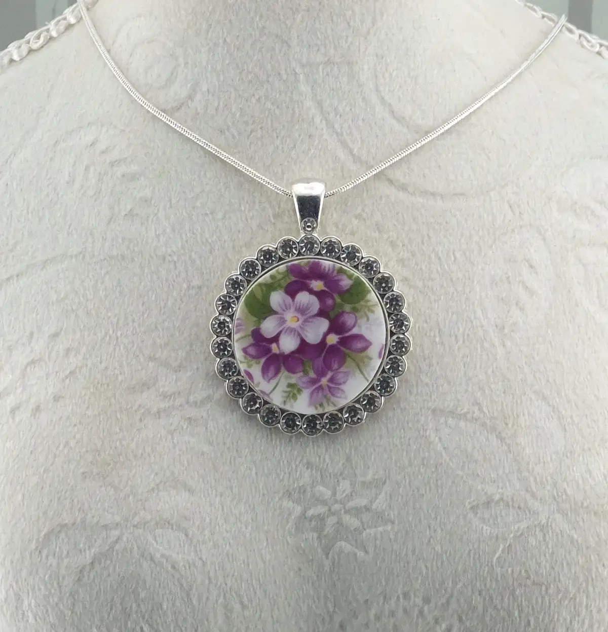 Each design is carefully cut from an original china plate, hand-shaped, and set into a silver-toned bezel. Because every section of the plate features slightly different pattern placement, no two pendants are ever exactly alike.
