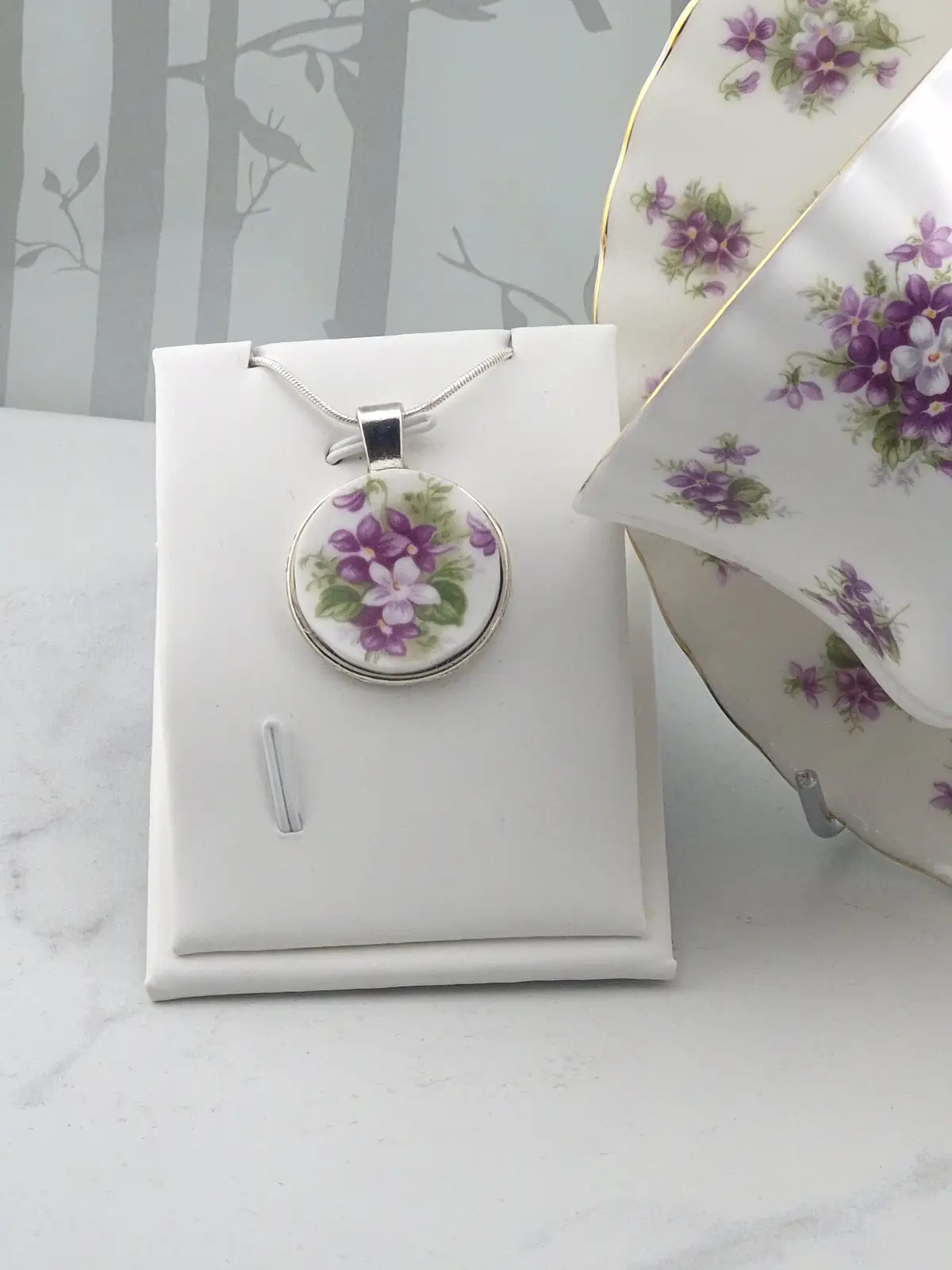 Each design is carefully cut from an original china plate, hand-shaped, and set into a silver-toned bezel. Because every section of the plate features slightly different pattern placement, no two pendants are ever exactly alike.